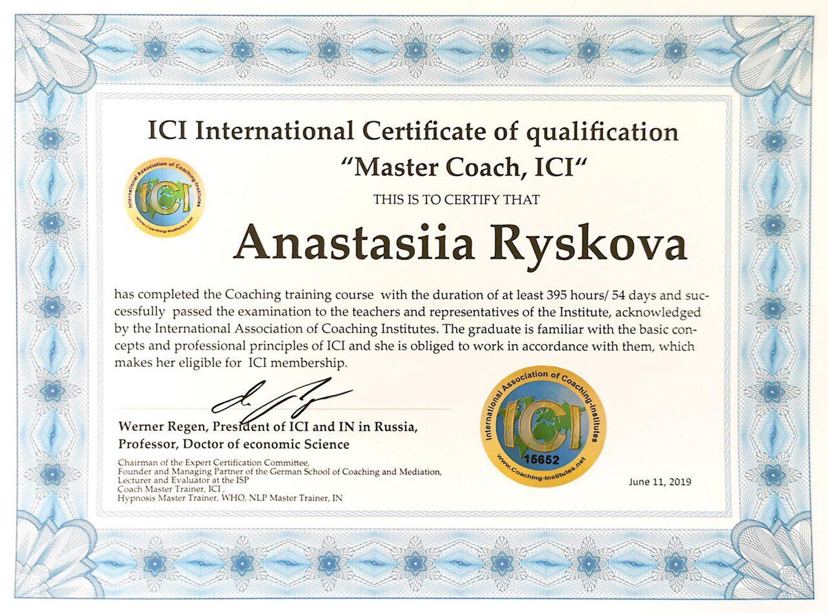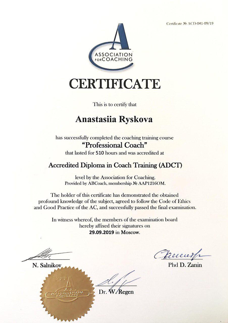 - Коуч международной ассоциации Association for Coaching (Великобритания)